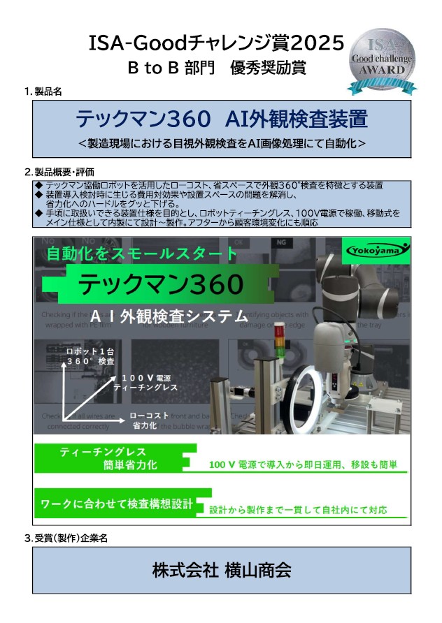 「テックマン360 AI外観検査装置」がBtoB部門 優秀奨励賞を受賞いたしました。