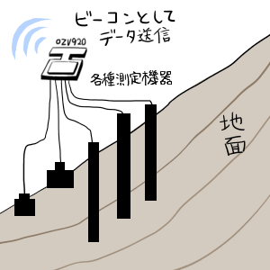 OZVを地すべり監視のビーコンとして、定期的にデータを送信させます。920MHz帯モジュールはモジュール単体での伝送距離が長く、雪が積もった中からでもデータ通信を行うことが可能です。